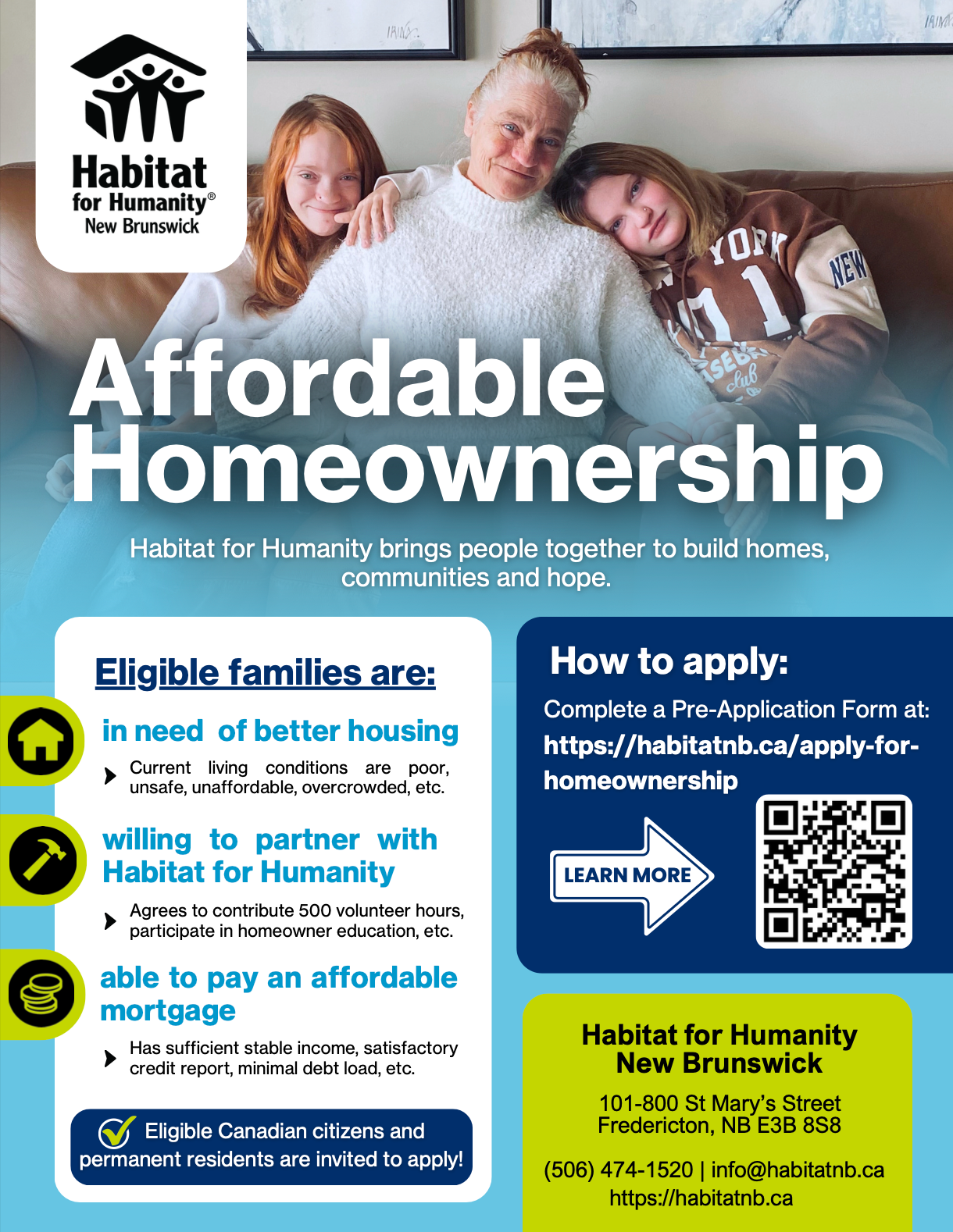 Habitat for Humanity NB builds safe, energy-efficient homes for families who are ready to take the next step toward homeownership but may not qualify for traditional mortgages. Through Habitat’s unique, no-down-payment model, families purchase homes at appraised value with payments based on household income - creating a sustainable path to stability and independence.